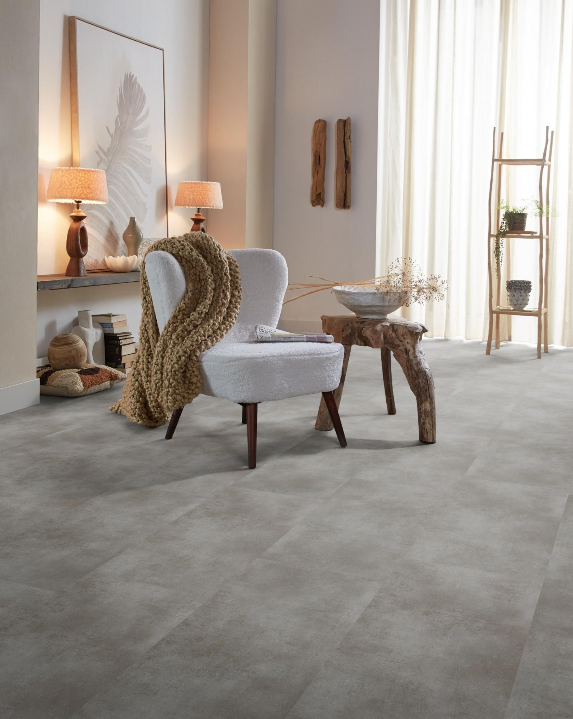 Het populaire betonlook is niet meer weg te denken uit onze pvc collectie. De moderne en strakke uitstraling van deze vloer komt prachtig tot zijn recht in ieder interieur en is daarnaast gemakkelijk te combineren. De tegels zijn waterbestendig en mede daardoor zeer gemakkelijk in onderhoud. Met de sterke toplaag van 0.55 mm heb je jarenlang plezier van dit tijdloze dessin.